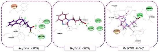 Considering that docking program detects favorable interactions of Met312 and His170 with a favorable positioning of both residues in molecules 8a, 8b, and 8d, a shape complementarity can be perceived with these molecules with respect to the cavity so that Van der Waals-type interactions are favored.