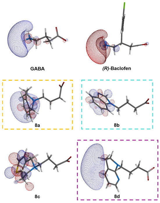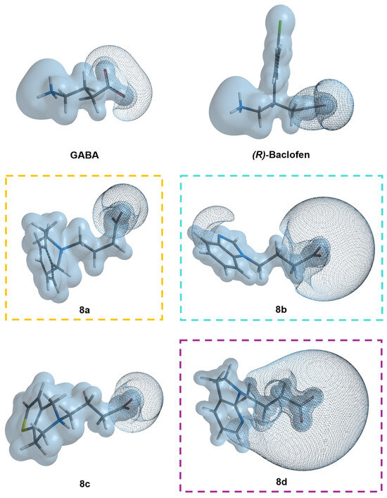 A molecular electrostatic potential surface of ±320 kJ/mol was calculated for our three best derivatives to evaluate their interaction elements (Figure 10). The regions where the GABA analogs could interact with positively charged aminoacidic residues at the GABAB receptor with an electrostatic potential value of −320 kJ/mol are represented as purple mesh surfaces. In all the cases, these regions are located on the carboxylate anion. In 8b, there is an extra basic region on the nitrogen sp2; in 8d, this basic region is extended to both nitrogen atoms (sp2 and sp3) located in the bicycle and is a bigger surface than in 8a and 8b. These findings correlate with the MEP maps presented in Figure 9. The acidic regions, with a positive electrostatic potential value, are over all the molecular skeleton, with the highest extensions on the most acid protons; these protons are mostly found in the nitrogen substitution and this finding is better observed in Figure S58.