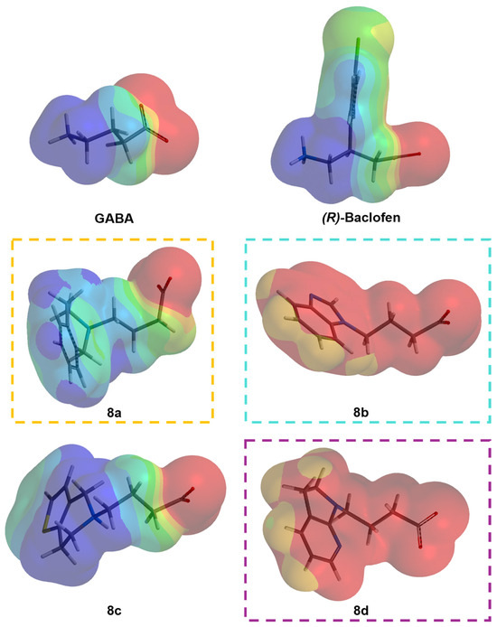 To analyze the electronic properties of our best candidates, we studied the MEP of these compounds. In Figure 9, the MEPs of 8a, 8b, and 8d, as well as GABA and Baclofen are presented. Of the three best candidates, only 8a is a zwitterionic molecule that presents a dipole as observed in GABA and (R)-Baclofen. A negative-basic region is observed on the carboxylate anion (red color), while a positive-acidic region is present on the amine substitution region. In the case of 8b and 8d, as they are anionic molecules, the MEP’s surface is colored red with some yellow regions where acidic hydrogen atoms are located. 8c is also a zwitterionic molecule that concentrates the acidic region on the bicyclic substituent, but presents less acidic protons in compared to 8a, 8b, and 8d.