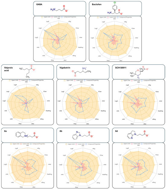 From the ADME properties of the GABA analogs, it is observed that 8a has a LogP value of −2.364, suggesting better solubility in water. 8b (LogP = −1.063) and 8d (LogP = −0.727) have a decreased solubility in water, which could be beneficial for their activity in contrast to 8a. On the other hand, it can be seen in Figure 11 that molecules 8b and 8d have a greater TPSA value (57.95 Å2 and 56.26 Å2) than 8a (44.57 Å2), but low values when compared to GABA or Baclofen (67.77 Å2 for both molecules). The ADME properties of Gabapentin and Pregabalin are shown in Figure S59.