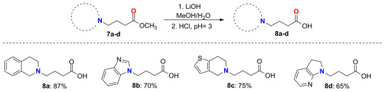 GABA analogs were synthetized from 4-bromobutyric acid, which was previously esterified to protect the carboxylic acid (Table 1). Subsequently, N-alkylation of ester 6 with the corresponding heterocycles (a–c) was carried out. Due to the nucleophilic character of the nitrogen in the tetrahydroisoquinoline (a), the reaction proceeded without the use of base, providing compound 7a with 75% of chemical yield. In the case of benzimidazole (b), we attempted to carry out the N-alkylation under the same reaction conditions; however, the reaction did not proceed as expected due to the lower nucleophilic character of the nitrogen atom and the low solubility of heterocycle (b) in ester 6. To find the optimal reaction conditions for the N-alkylation of ester 6, we carried out experiments with different bases such as N,N-diisopropylethylamine (DIPEA), K2CO3, and Et3N, but the yields were very low; however, good yields with N,N-diisopropylethylamine (DIPEA) and the use of CH3CN as a solvent were obtained (Table 1). After some experimentation, compound 7b was isolated in 65% yield when the reaction was carried out at 60 °C with 1.5 eq of DIPEA as a base in CH3CN. In a similar manner, we were also able to perform the N-alkylation substitutions with 4,5,6,7-tetrahydrothieno[2,3-c]pyridine (c) and 2,3-dihydro-1H-pyrrolo[2,3-b]pyridine (d), using CH3CN as a solvent and DIPEA as the base, to obtain products 7c and 7d with 70% and 30%, respectively.
