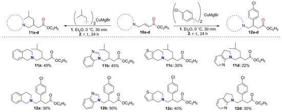 Successive treatment of the α,β-unsaturated systems 10a–d with the organocopper reagents (CH3)2CHCH2)2CuLi and (p-Cl-C6H4)2CuLi led to the Pregabalin and Baclofen precursors 11a–d and 12a–d, respectively, with moderate to good yields (Scheme 2). Several reaction conditions were tested to increase the chemical yields of these conjugate additions; unfortunately, an increase in the equivalents of the copper reagent and reaction times had no effect on the chemical yield, probably due to the labile nature of these reagents, which easily decompose under the reaction conditions used (Scheme 2).