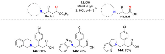 On the other hand, compounds 12a–d were subjected to basic hydrolysis. In the first step, molecules 12a–d were treated with lithium hydroxide, and then the corresponding carboxylates were treated with aqueous HCl to form the corresponding acid derivatives 14a, 14b, and 14d in good yields; however, it was not possible to isolate compound 14c (Scheme 4) due to its oily nature.