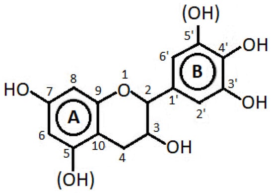 Condensed tannins (CTs), depicted in Figure 2, can be functionalized as renewable building block polymers for blending in thermoplastics [57]. In particular, they can be esterified through anhydrides with the idea of promoting their facile melt processing in plastics, which has been proved effective on poly(lactic acid) (PLA) [58]. CTs derived from Pinus radiata bark were added to biodegradable polyesters BionolleTM and BiopolTM; in this case, forming longer alkyl chain hexanoate esters promotes tannin miscibility to the biopolymers, while short-chain acetate esters acted rather as fillers in the postprocessing phase [59]. With this process, it was also possible to offer an improvement of properties to bacterial polymers, such as poly(hydroxybutyrate) (PHB), comparing the effect of tannic acid obtained from grape pomace through a hydroalcoholic extract and that of lignocellulosic biomass [60]. The valorization of grape pomace can, via a biorefinery approach, lead to the production of various chemicals, such as PHB, polyphenols, volatile fatty acids, and biogas. As discussed above, this is only one of the possibilities from the more general use of waste from wine production, such as grape stalks and residue in biopolymers as fillers for PLA, PHB, and poly(butylsuccinate) (PBS) with functionalization for the scope, yet without any real role attributed to tannins [61,62,63]. On the other side, provided a sufficient dispersion is achieved, CT can be blended with biopolymers, such as is the case for poly(hydroxybutirate-co-valerate) (PHBV) in the formation of multifunctional additives; a solvent casting process has allowed the content of tannins to be increased up to 10% [64]. Among the advantages, when introducing tannins in bioplastic packaging, is the possible colorimetric detection of ammonia vapors, which will allow detecting the possible spoilage of some food items (e.g., fish) [65]. The antioxidant properties of condensed tannins, specifically extracted from Acacia Mangium, were confirmed again, both on PLA [66] and poly(vinyl alcohol) (PVA) [67].