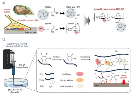 Hierarchized blended fibers between gallol and chitosan, mimicking byssus function: (a) chemicals involved in adhesion; (b) biomimicry process [81].