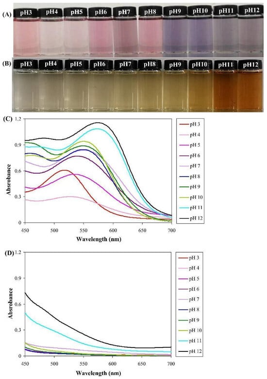 Color variations of κ-carrageenan films added with (A) pomegranate flesh extracts (PFE) and (B) pomegranate peel (PPE). UV-Vis spectra of (C) PFE and (D) PPE in a pH interval between 3 and 12 [90].