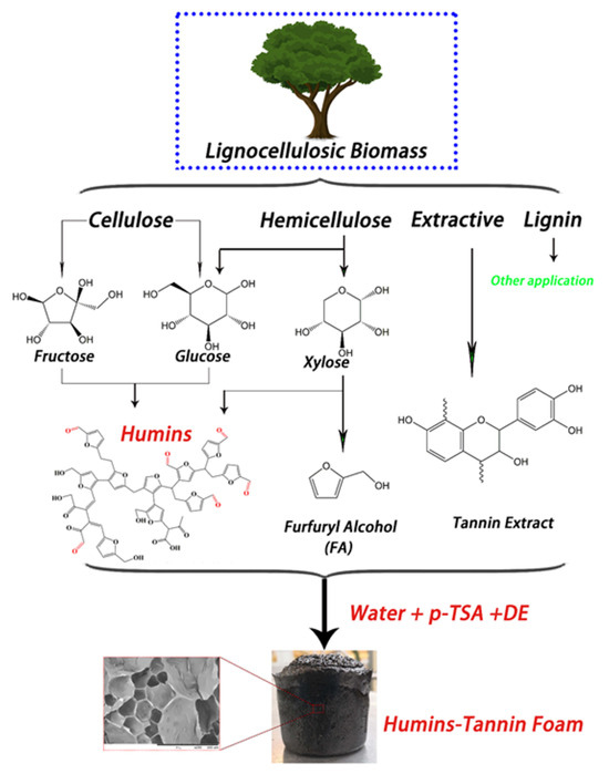 To enter the sector of constructions, structures such as tannin-based polyurethanes [102] or biofoams [103] have also been developed. This has been realized also in combination with furan to obtain tannin–furanic foams, which may equally have a quasi-exclusive bio-based content [104], with the advantage, offered by furans, of potential high temperature applications [105]. The foaming action might also involve the incorporation of polysaccharide-based products, such as humins [106]. In practice, polyfuranic humins, a biorefinery product, served to promote the self-blowing action of mimosa-extracted tannin-based foams (Figure 5). This is attributed to the fact that, under very low pH, which is a condition that seldom occurs in soil, heated humins can self-crosslink, a reaction that can be accelerated through a strong acid initiator, e.g., p-toluene sulfonic acid (pTSA) and a foaming agent (DE). Humins are the insoluble part of soil biomass, which normally are not precisely defined as for chemical composition [107] yet are precipitated in the form of solid microspheres [108], and can be obtained by an acidic treatment of polysaccharides. This insolubility in water is the main characteristic that differentiates them from tannins [109]. In general terms, humins have been considered an issue for biomass processing, yet, on the other hand, their insolubility has allowed them being mixed with tannins with a characteristic self-blowing effect at room temperature. In particular, for materials processing, humins oligomers tend to form complex crosslinked networks through physical aggregation while absorbing other molecules [110], which enable their use as building blocks for durable polysaccharide-based bioplastics [111]. Flax-fiber-reinforced composites with similar properties between humins and tannins as potential matrices have been reported [112]. Tannins can also serve in non-furanic polyurethane adhesives to the improvement of humins’ properties, where the two biomaterials appeared to form a crosslinked network gradually disentangling with temperature [113].