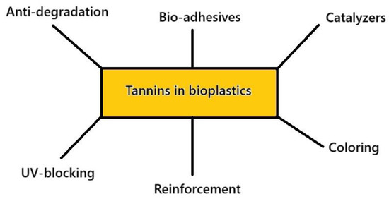 The objective of this review is to discuss the various roles of tannins in polysaccharide-based plastics. In particular, these molecules are obtained from a large number of species and do represent by-products of other sectors, such as the production of food additives, or the development of medical treatments. The actions that tannins are able to perform in this sector are diverse, from recently promoting enzymatic polymerization of biomass-derived polyphenols, e.g., obtained from biorefinery processes [18], to offering an antioxidant effect on bioplastics [19]. Ordering and classifying the various potential actions represents an essential task given that waste biomass bioplastics are being developed in competition and at the expense of monomer-based ones, such as poly(lactic acid) (PLA). This indicates the timeliness and necessity of the present review.