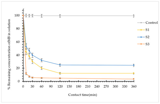 The effect of contact time on the extent of dye adsorbed onto the three marine adsorbent materials (and therefore removed from the aquatic solution) in terms of the percentage amount remaining in solution versus contact time was investigated. The data acquired after the mechanical agitation of 7 mg L−1 MB seawater solution–sediment mixtures for 10, 20, 30, 60, 120, and 360 min are presented in Figure 2 for all the selected marine sediments and control experiments. The experiments focusing on the effect of contact time on the extent of dye adsorbed onto the three marine adsorbent materials were conducted prior to the others. Therefore, since they were performed in the preliminary phase, they occupy a different mass of adsorbent (0.5 g L−1) than the optimum dose (2 g L−1).