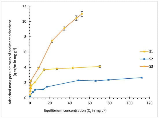 In the related literature, the adsorption process is usually investigated by plots/isotherms that relate to the solute’s relative concentrations in solution (Ce) and adsorbed to the solid adsorbent (q). For that purpose, ten test substance initial concentrations (Ci) were used between the range of 5 and 300 mg L−1 in batch adsorption tests, as described in Section 2.1. (Experimental conditions: volume of MB seawater solution = 50 mL; dose of adsorbent = 2 g L−1; contact time = 2 h; pH = 8.00; T = 20 °C ± 1 °C). The range of concentration levels of MB in the initial seawater solution that was in contact with the marine sediment was slightly different for the case of the S3 sediment sample. The lowest initial concentration of 5 mg L−1 (included in the cases of sediments S1 and S2) was not studied, since total removal of MB through adsorption was expected to occur. Additionally, S3 was the only sample for which the highest of 300 mg L−1 was tested (Table S2, Supplementary Materials). After adsorption equilibrium was reached, individual spectrophotometric analysis of the aqueous phases was performed and the solution’s equilibrium concentrations (Ce) of MB were determined, and the amount of dye adsorbed on the marine sediment’s surface was calculated from the depletion of the test substance in the solution (indirect method). The adsorbed mass per unit mass of adsorbent was plotted as a function of the equilibrium concentration of the test substance [36]. Derived data are illustrated in Figure 3 (and Table S3, Supplementary Materials) and were further processed via the four selected isotherm models (Freundlich, Langmuir, Henry, and Temkin) in order to draw safer conclusions regarding the study of the specific process [35,36,37,38,39,40,41,42,43,44].