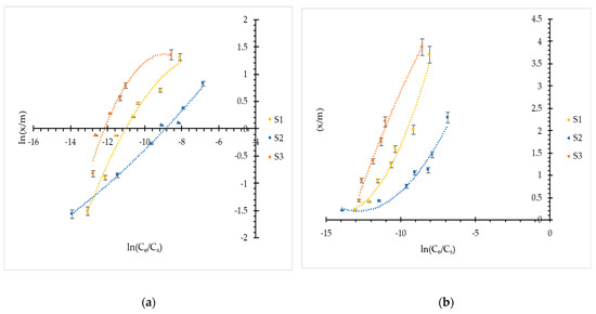 According to the relevant scientific literature, in order to draw useful and safe conclusions regarding the affinity of the solid adsorption surface (i.e., marine sediments) with the adsorbed substance, the production of plots that describe the extent of adsorption in conditions of saturation of the aqueous solution is suggested, as in, for example, the function ln(x/m) = f[ln(Ce/Cs)] [46]. In Figure 4, the relative graphs obtained that show the correlation for each one of the three sediments examined with the synthetic dye MB through the relations (a) ln(x/m) = f[ln(Ce/Cs)] and (b) (x/m) = f[ln(Ce/Cs)], where Ce is the adsorption equilibrium concentration and Cs is the solubility of synthetic test compound in water (43.6 g/L, data from reference [47]), are illustrated.