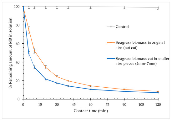 In addition, according to Figure 5 data, the estimated rate of the process was greater in the material of seagrass biomass that had been divided into small pieces compared to not-cut seagrass biomass. This observation was expected since the increase in the surface area of adsorbent accelerates the phenomenon, especially in the initial stages, when diffusion and dispersion from the solution between the pores of the adsorbent take place. Finally, a negligible amount of MB degraded during the control experiment (MB in seawater without adding algal biomass, Figure 5).