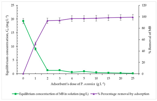 The effect of the adsorbent’s dose on the extent of MB dye adsorption (in terms of percentage removal and equilibrium concentration) was investigated by the conduction of a series of batch adsorption experiments using different amounts of algae mass of P. oceanica species. Hence, individual masses of adsorbent material ranging between the values of 1 and 25 g L−1 were used, mixed with 50 mL of dye standard solution at three concentration levels (20 mg L−1, 30 mg L−1 and 50 mg L−1) and shaken mechanically to reach the adsorption equilibrium (contact time 60 min, stirring speed 150 rpm, pH = 5.77, T = 20 °C ± 1 °C). The relevant data for the initial concentration level of 20 mg L−1 are given in Figure 6, indicating that the percentage removal of MB increased with the increase in the dose of adsorbent. This may be due to the increase in availability of surface-active sites resulting from the increased dose and conglomeration of the adsorbent, which is in accordance with the findings of other researchers [20,38,48].