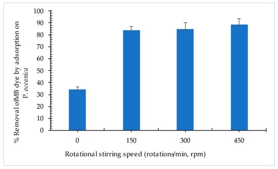 Batch adsorption experiments with constant algal biomass (2 g L−1) and an initial concentration of MB dye of 30 mg L−1 (volume of MB seawater solution 50 mL) were performed at different mechanical rotational stirring speeds (0, 150, 300 and 450 rpm) to study the effect of rotational speed on the adsorption capacity of the seaweed P. oceanica. After 60 min of mechanical agitation (to reach adsorption equilibrium), the equilibrium concentration of the target dye substance was determined via spectrophotometric analysis and the corresponding results are summarized in Figure 7 (in terms of percentage removal by adsorption).