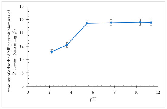 In order to study the effect of pH of the aquatic solution containing the dye on the adsorption process onto algal biomass, experiments were carried out over a range of pH values (2.20 to 11.80). The pH was adjusted to the desired value by adding sodium hydroxide (NaOH) or a hydrogen chloride (HCl) solution. The results of the measurements are given in Figure 8, where the quantity of adsorbed MB pigment per unit mass of P. oceanica seaweed (mg of MB per g of biomass) as a function of pH is depicted. As can be seen, a lower adsorption capacity was measured at pH 2.20 (11.18 mg g−1), which increased with the pH up to 5.45 (15.59 mg g−1) and then remained almost constant even at basic pH 11.50.
