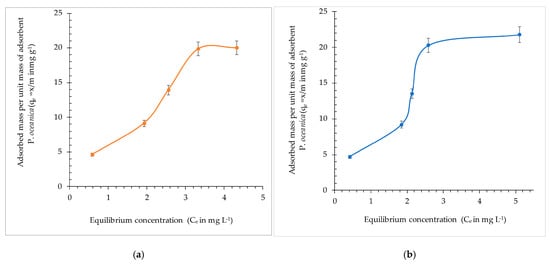 Several researchers have already reported that the aqueous solution’s pH is an important parameter influencing the sorptive uptake of dyes because of its profound impact on both the surface-binding sites of the biosorbent and the ionization/aggregation process of the dye molecules [12,19,20,38]. The lower adsorptive capacity that was noted at the most acidic value studied (pH = 2.20) can be attributed to the fact that MB is a cationic substance (pKa = 3.14 up to 3.851, Table S1, Supplementary Materials), combined with the phenomenon that, at low pH values (or high concentrations of hydrogen cations H+), the surface of the seaweed can be positively charged (primary via protonation of functional groups contained in polysaccharides, lipids and proteins). Therefore, due to the repulsive electrostatic forces between the adsorbent and the absorbate, reduced adsorption occurred at pH = 2.20. Consequently, pH = 5.45 was set as the optimal value for the maximum adsorbent capacity and used in the rest of the adsorption experiments, including the study of adsorption isotherms. The results of the present study regarding the influence of the solution’s pH on the biosorption of MB by algae are consistent with those of other published studies that involved the study of the biosorptive uptake of MB using various species of algae, such as the Mediterranean green alga Enteromorpha spp. [20], and P. oceanica [19], which showed that the equilibrium biosorption capacity was optimal under alkaline conditions (pH = 6–10) and minimum at acidic pH 2 [19,20].