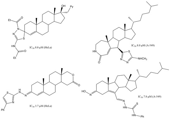 Steroidal heterocyclic derivatives reported in the literature with cytotoxic activity against various human cancer cell lines [21,22].