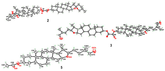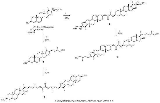 A second dimeric structure was synthesized starting from the known diosgenin acetate 4, prepared according to the reported procedure [31]. Reductive F-ring opening of 4, carried out under previously described conditions (AcOH/NaCNBH3) [30], afforded the new compound 5, whose molecular structure was confirmed by single-crystal X-ray diffraction (Figure 2). Subsequent esterification of the 26-OH group of 5 with oxalyl chloride yielded the novel dimeric derivative 6.