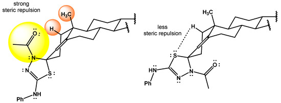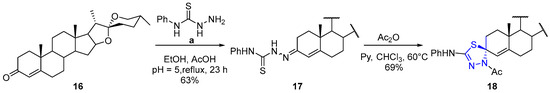 Steroidal thiosemicarbazones, in particular, have demonstrated diverse biological activities, including antitubercular [5,6], antimicrobial [7,8], and anticancer properties [9,10,11]. These moieties serve as valuable precursors for a wide array of heterocyclic systems with significant pharmacological relevance, such as thiazolidinones [12,13], imidazolidinones [14], thiadiazoles [15,16], thiazoles [17], and thiadiazolines [18]. Among these, 1,3,4-thiadiazoline derivatives have attracted increasing interest due to their pharmacological potential [18,19]. These heterocycles are readily accessible via the well-known intramolecular cyclization of thiosemicarbazones using acid anhydrides or acid chlorides [20].