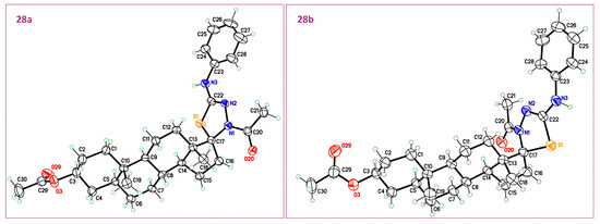 A similar strategy was applied to trans-androsterone (24). Condensation with thiosemicarbazides provided the crude thiosemicarbazone 25, which, without isolation, was converted into the spirothiadiazolines 26 in an 8:2 epimeric ratio. The preferential formation of the major epimer likely arises from the structural arrangement of the steroidal core and the steric influence of the neighboring methyl group. In contrast, thiosemicarbazone 27 was successfully isolated as yellow crystals and further cyclized to give the diastereomeric mixture 28, which was also analyzed by single-crystal X-ray diffraction.