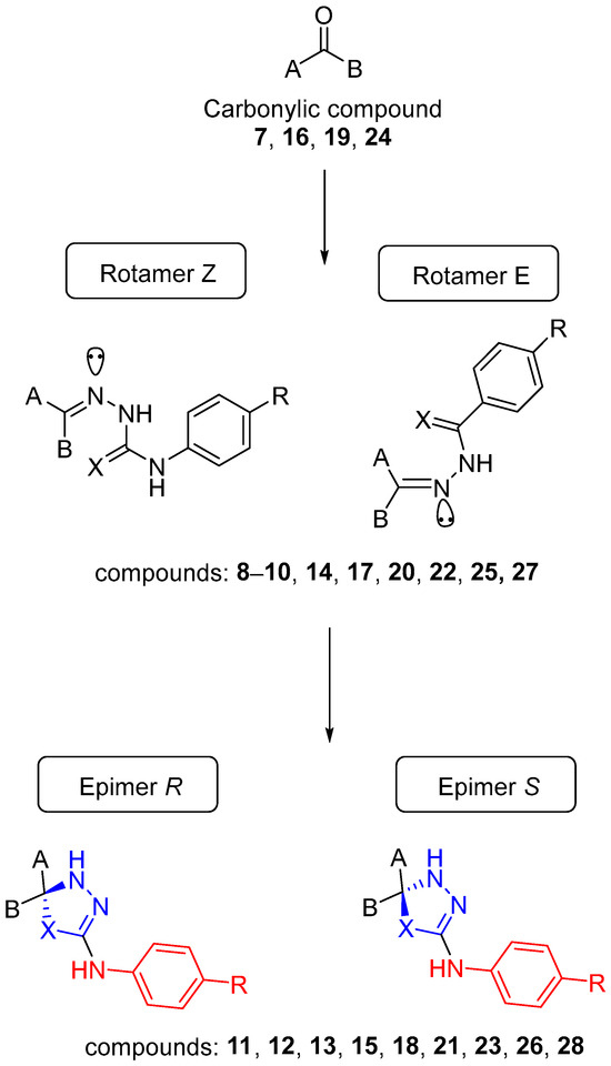 To provide a comprehensive overview of the synthetic approach, a general scheme (Scheme 2) is presented, summarizing all transformations leading to the steroidal 1,3,4-thia(selena)diazoline derivatives. This scheme integrates the individual synthetic routes described in detail in the following sections, highlighting the starting materials, key intermediates, and final products obtained. As part of this strategy, the construction of a heterocyclic linker was achieved through the formation of thio- and selenosemicarbazone fragments. These intermediates may exist as Z/E isomers due to restricted rotation around the C–N bond, which exhibits partial double-bond character by resonance. Consequently, a rotameric equilibrium can theoretically be observed in all thio- and selenosemicarbazones. Upon intramolecular cyclization under basic conditions, the nucleophilic sulfur or selenium atom can attack from either the top or bottom face of the molecule, leading to mixtures of epimers. Scheme 2 summarizes this general synthetic route, also illustrating the possible formation of the different stereoisomers.