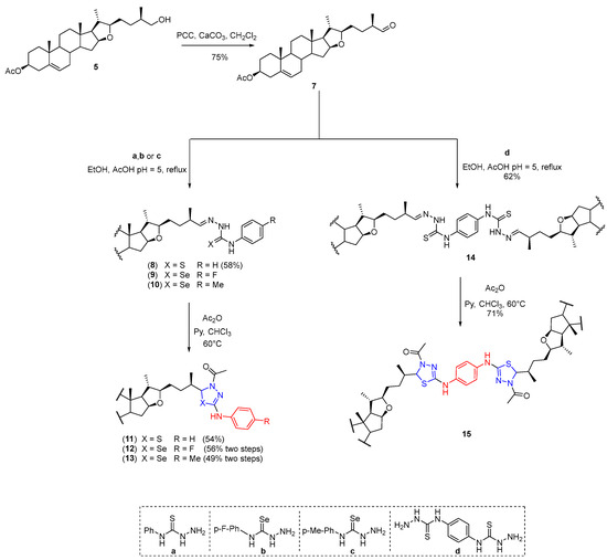 After exploring the synthesis of oxalate-linked dimers as a strategy to increase molecular complexity and flexibility, our attention was directed toward the introduction of heterocyclic linkers to further diversify the steroidal scaffold. In this context, thio- and selenosemicarbazones were selected as versatile intermediates, not only due to their intrinsic pharmacological relevance but also because they can undergo intramolecular cyclization to yield 1,3,4-thia(selena)diazoline systems. The following section describes the general synthetic approach used to access these heterocycles.