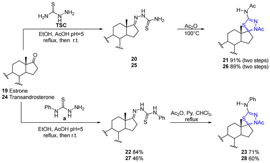 Commercially available estrone (19) and trans-androsterone (24) were employed as starting materials (Scheme 5). Condensation of estrone (19) with thiosemicarbazides TSC and a afforded the corresponding thiosemicarbazones 20 and 22, respectively. While compound 20 was not isolated, its crude product was subjected to intramolecular cyclization with acetic anhydride at high temperature to furnish the spirothiadiazolines 21 as a 1:1 epimeric mixture in excellent yield. In contrast, thiosemicarbazone 22 was isolated and subsequently cyclized under Ac2O/pyridine conditions, affording the diastereoisomeric thiadiazolines 23 in a 6:4 ratio. The modest diastereoselectivity may be attributed to the steric effects of the substituents on the amino residue (Ac or Ph).