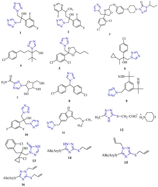 Drugs based on 1,2,4-triazole (1–11) and 1,2,4-triazole-3-thione (12–16). The skeleton of 1,2,4-triazole is shown in blue.
