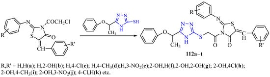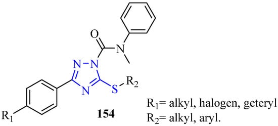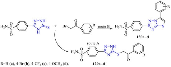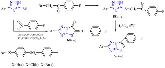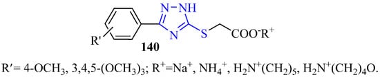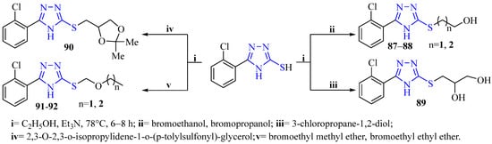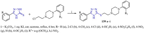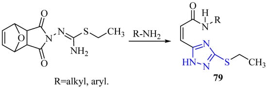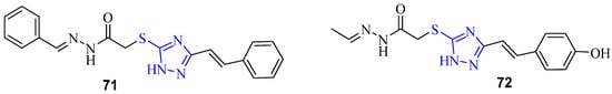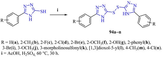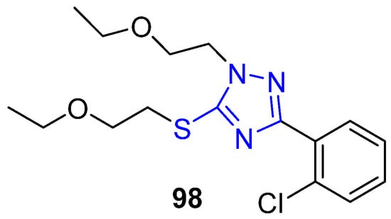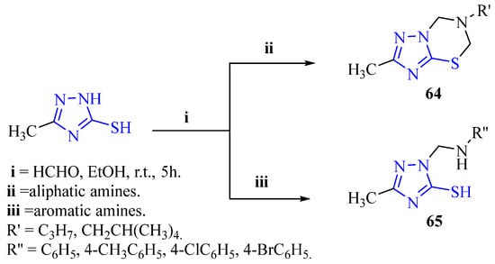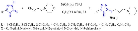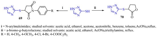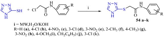 Using microwave irradiation methods, Manikrao A.M. et al. synthesized a series of 3-(N-substituted carboximidomethylthio)-(4H)-1,2,4-triazoles 54a–k by the reaction of 3-mercapto-(4H)-1,2,4-triazole and N-substituted chloroacetamides in aqueous KOH [71]. This method was found to be rapid and economical, with microwave reactions proceeding smoothly within 2–6 min in yields of 62–85% 54a–k.
