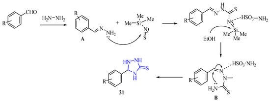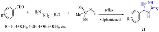 For example, Mane M.M. et al. [51] used this method to synthesize several 5-aryl-[1,2,4]triazolidine-3-thiones 21 with different substituents on the aromatic ring. The corresponding aldehyde and hydrazine hydrate were stirred at room temperature in ethanol, and then trimethylsilyl isothiocyanate (TMSNCS) and sulfamic acid were added to the resulting mixture and boiled for 25–40 min (Scheme 2).