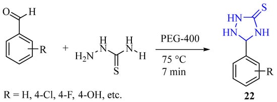 Ramesh R. et al. [52] developed a simpler and more convenient method for the synthesis of 5-aryl-1,2,4-triazolidin-3-thiones using various aromatic aldehydes and thiosemicarbazide. As a result of numerous experiments, considering different options for using solvents (ethanol, methanol, polyethylene glycol, etc.), reaction time, and temperature, the authors found effective synthesis conditions: polyethylene glycol (PEG-400) as a medium, a time of 7 min, and a temperature of 75 °C, yielding 94% (Scheme 4).