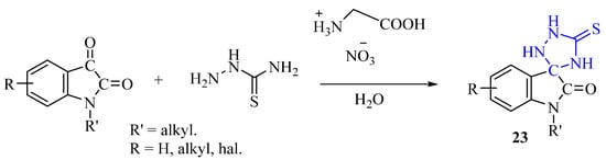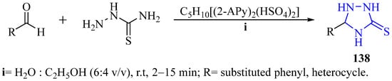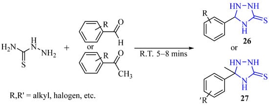 Masram L.B. et al. [56] using meglumine as a “green” catalyst and carried out a one-pot reaction of various substituted aldehydes or ketones with thiosemicarbazide in aqueous medium to afford 5-substituted-1,2,4-triazolidine-3-thiones 26–27 (Scheme 8).