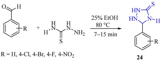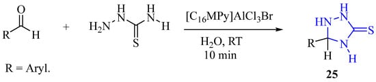 Because these condensation reactions between aromatic aldehydes and thiosemicarbazide proceeded smoothly without the use of a catalyst in high yields of triazolethiones, the authors of [52] called this method environmentally friendly or “green”. Similar to this work, the authors of other studies [53,54,55] developed several milder conditions for the synthesis of 5-aryl-1,2,4-triazolidine-3-thiones 23–25 in high yields (solvents—water, aqueous ethanol) or used [C16 MPy]AlCl3Br as a catalyst (Scheme 5, Scheme 6 and Scheme 7).