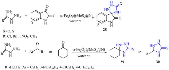 A series of potentially biologically active 1,2,4-triazolidin-3-thiones and hybrid spirotriazoles 28–30 were obtained by the authors of [57] using a magnetic nanocatalyst (α-Fe2O3@MoS2@Ni) (Scheme 9).