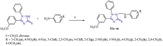 Godhani D.R. et al. [58] synthesized a series of new Mannich bases by reacting 5-(3-methoxypenyl)-1-phenyl-1H-1,2,4-triazole-3(2H)-thione with substituted anilines (CH2O, dioxane, yields 52–74%) (Scheme 10):