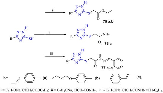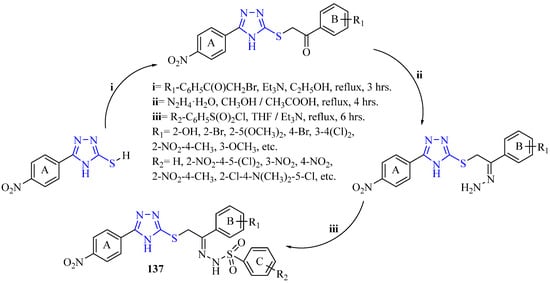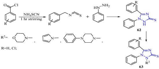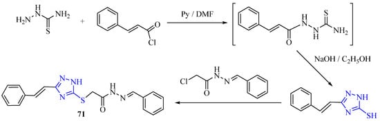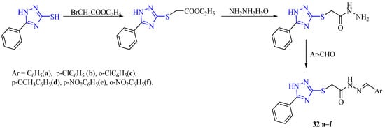 In order to search for new antimicrobial and antifungal agents, Dayama D.S. et al. [59] obtained several new arylhydrazones of 5-phenyl-1-H-1,2,4-triazole-3-thione with good (66–73%) yields using multi-step reactions (Scheme 11).