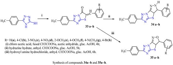 The obtained compounds 33a–h were then converted by condensation reactions with hydrazine hydrate (glac. AcOH, anhyd. CH3COONa, 5h, yield 59–65%) and hydroxylamine hydrochloride (glac. AcOH, anhyd. CH3COONa, 6h, yield 66–71%) into the target compounds—3-(substituted-phenyl)-6-(p-tolyl)-3,3a-dihydo-2H-pyrazolo[3/,4/:4,5]thiazolo[3,2-b][1,2,4]-triazole 34a–h and 3-(substituted-phenyl)-6-(p-tolyl)-3,3a-dihydo-isoxazolo[3/,4/:4,5]thiazolo[3,2-b] [1,2,4]-triazole 35a–h, respectively. These compounds were screened for antimicrobial activity against various strains, including B. subtilis (MTCC-1133), B. thuringiensis (MTCC-4714), E. coli (MTCC-443), and P. aeruginosa (MTCC-2297). Most of the tested compounds showed moderate antimicrobial activity, comparable to that of the standard drugs streptomycin and chloramphenicol. Compounds 34b, 34d, 34h, 35d, and 35h showed high activity at the level of the standard drug streptomycin (MIC 3.125 mg/mL) against Mycobacterium tuberculosis H37Rv. It should be noted that the compounds that showed good anti-tuberculosis activity have electron-donating (Cl, NO2, Br) substituents.