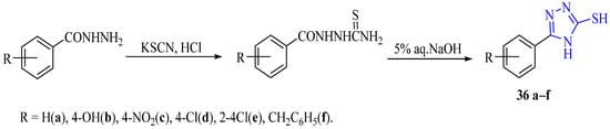 Agrawal R. et al. [61] synthesized and characterized a series of 5-aryl-substituted-4H-1,2,4-triazole-3-thiols 36 having various aryl substituents from the corresponding thiosemicarbazides in medium (51–75%) yields (Scheme 13).