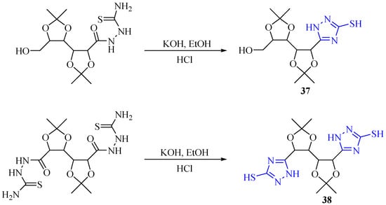 Using one of the main methods for the synthesis of 1,2,4-triazole-3-thiones, M. Belkadi et al. obtained from 2-{[5′-(hydroxymethyl)-2,2,2′,2′-tetramethyl-4,4′-bi-1,3-dioxol-5-yl]carbonyl}hydrazine-carbothioamide and 2,2,2′,2′-tetramethyl-4,4′-bi-1,3-dioxolane-5,5′-dihydrazine-carbothioamide by boiling in ethanol (KOH) in high yields (84–85%) the corresponding [5′-(5-mercapto-2H-1,2,4-triazole-3-yl)-2,2,2′,2′-tetramethyl-4,4′-bi-(1,3-dioxolanyl)-5-yl]methanol 37 and 5,5′-(2,2,2′,2′-tetramethyl-4,4′-bi-1,3-dioxolane-5,5′-diyl) bis (1H-1,2,4-triazole-3-thiol) 38 (Scheme 14) [62].