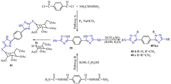 Using two different methods (method A: terephthalolyl dichloride, thiosemicarbazide, pyridine, stirring at room temperature; method B: 2,2′-(Benzene-1,4-diyldicarbonyl)dihydrazinecarbothioamide, ethanolic solution of KOH, refluxed), Datoussaid Y. et al. [63] synthesized an interesting bis triazolethione—5,5′-benzene-1,4-diylbis(1H-1,2,4-triazole-3-thiol) 39. However, the yields of 39 were significantly different, with 72% for method A and 96% for method B. Further interaction of 39 with dimethyl sulfate in an aqueous KOH solution with an equimolar and two-fold excess of the alkylating agent yielded 5,5′-Benzene-1,4-diylbis[3-(methylsulfanyl)-1H-1,2,4-triazole] 39b and 5,5′-Benzene-1,4-diylbis[1-methyl-3-(methylsulfanyl)-1H-1,2,4-triazole] 39c, respectively, in the same (75%) yields (Scheme 15) [63].