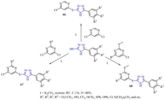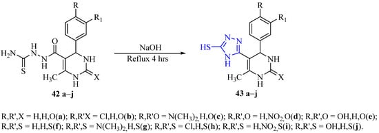 A series of pyrimidine derivatives were synthesized by Andrews B. et al.—3,4-dihydro-5-(5-mercapto-4H-1,2,4-triazol-3-yl)-6-methyl-4-(R-phenyl)pyrimidin-2(1H)-one 43a–e and its thio analogue 3,4-dihydro-5-(5-mercapto-4H-1,2,4-triazol-3-yl)-6-methyl-4-(R-phenyl)pyrimidine-2(1H)-thione 43f–j were obtained by treatment of the corresponding carbothioamide compounds 42a–j in good yields of 76–90% (Scheme 16) [64].