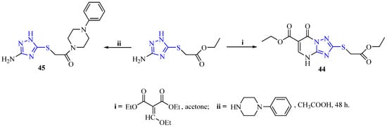 El-Feky S.M. et al. [66] reacted ethyl 2-(3-amino-1H-[1,2,4]-triazol-5-ylthio)acetate with diethyl ethoxymethylenemalonate in acetone to obtain Ethyl 2-(2-ethoxy-2-oxoethylthio)-7-oxo-4,7-dihydro-[1,2,4]triazolo[1,5-a]pyrimidine-6-carboxylate 44 (83%). Prolonged stirring (48 h) of ethyl 2-(3-amino-1H-[1,2,4]-triazol-5-ylthio)acetate and phenylpiprazine in glacial acetic acid afforded 2-(3-amino-1H-[1,2,4]-triazol-5-ylthio)-1-(4-phenylpiperazin-1-yl)ethanone 45 in an average yield of 66% (Scheme 17) [66].