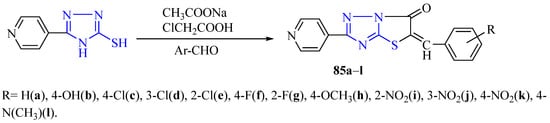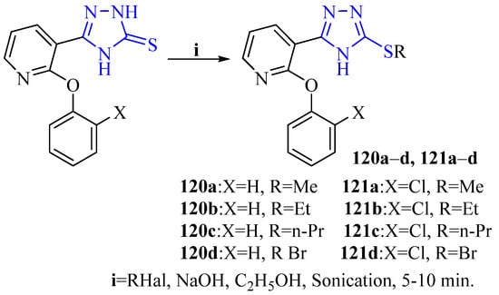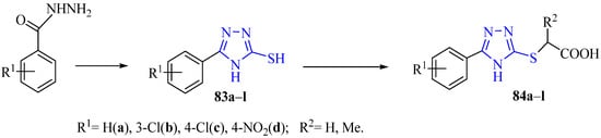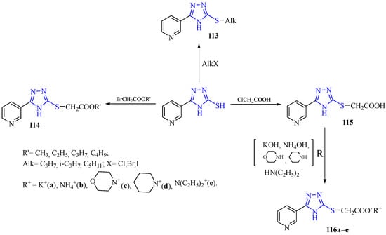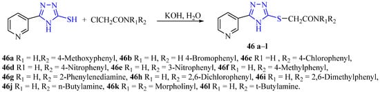 Reactions of 3-(3′-pyridyl)-1,2,4-triazole-5-thiol with the corresponding N-substituted-α-chloroacetanilides carried out by Mali R.K. et al. in an aqueous solution of potassium hydroxide gave the corresponding 5-(N-substituted carboxamidomethylthio)-3-(3′-pyridyl)-1,2,4-triazoles (46a–l) in a 60–86% yield (Scheme 18) [67].