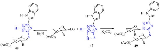 El Ashry E.S.H. et al. studied the glycosylation of 1,2-dihydro-5-(1H-indol-2-yl)-1,2,4-triazole-3-thione 47 in the presence of Et3N and K2CO3 as acid scavengers with 2,3,4,6-tetra-O-acetyl-α-D-glucopyranosyl bromide and 2-acetamido-3,4,6-tri-O-acetyl-2-deoxy-α-D-glucopyranosyl chloride [68]. By using Et3N, regioselective S-glycosides (S-) 48 were obtained, whereas using K2CO3, mixtures of two products (S- and S,N-1) having two glycoside fragments 49 were obtained (Scheme 19).