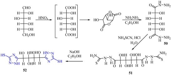 By a sequential synthesis in several stages, Amara S. et al. synthesized 2,3,4,5-tetrahydroxyhexanedihydrazide 50, from which 2,2′-(2,3,4,5-Tetrahydroxy-1,6-dioxohexane-1,6-diyl)dihydrazinecarbo-thioamide 51 was obtained. The authors then carried out cyclization reactions of 51 to obtain 1,4-bis(3-mercapto-1H-1,2,4-triazol-5-yl)butane-1,2,3,4-tetrol 52 [69]. Experiments carried out in an aqueous NaOH solution for 8 h at a temperature of 80 °C proceeded with a good yield (88%) of bis-triazole 52, while in ethanol, this cyclization occurred spontaneously at room temperature with a yield of 84.4%. It should be noted that all experiments were carried out without protection of the hydroxyl groups of D-glucose (Scheme 20).