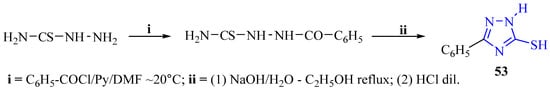 According to the traditional method, Ledeţi I. et al. obtained 1H-5-mercapto-3-phenyl-1,2,4-triazole 53 by benzoylation of thiosemicarbazide with benzoyl chloride followed by cyclization of 1-benzoylthiosemicarbazide with NaOH in an aqueous–alcoholic medium (Scheme 21) [70].