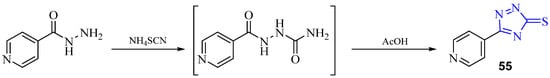 Farhan M.E. et al. [72] obtained isonicotinic acid thiosemicarbazide by reacting isonicotinic acid hydrazide with ammonium thiocyanate, followed by N-cyclization of which in an acidic medium (AcOH) to synthesize 5-(Pyridin-4-yl)-3H-1,2,4-triazole-3-thione 55 (Scheme 23).