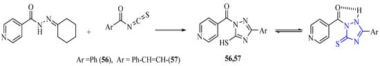 Other triazole derivatives containing a pyridine ring were also obtained. Thus, by boiling equal amounts of N’-cyclohexylidene benzohydrazide and benzoyl isothiocyanate in acetone for 1 h, (3-phenyl-5-thioxo-4,5-dihydro-1H-1,2,4-triazol-1-yl) (pyridin-4-yl)methanone 56 was synthesized in 51% yield. Replacing benzoyl isothiocyanate with cinnamoyl isothiocyanate under similar conditions, pyridin-4-yl(3-styryl-5-thioxo-2,5-dihydro-1H-1,2,4-triazol-1-yl)methanone 57 was obtained in a 51% yield (Scheme 24) [72].