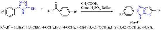 - Korol, N.I.; Slivka, M.V. Recent Progress in the Synthesis of Thiazolo[3,2-b][1,2,4]Triazoles (Microreview). Chem. Heterocycl. Comp. 2017, 53, 852–854. [Google Scholar] [CrossRef]
