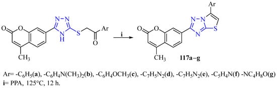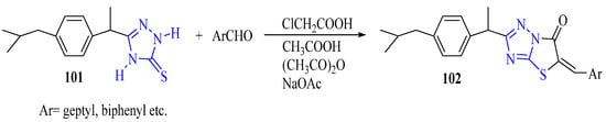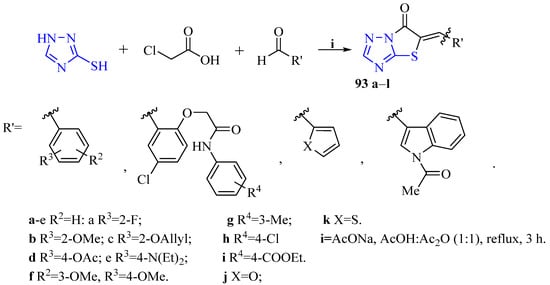 Seelam N. et al. [60] synthesized derivatives combining 1,2,4-triazole, thiazole, pyrazole, or isoxazole fragments in one molecule by reacting 5-mercapto-3-(p-tolyl)-1,2,4-triazole with chloroacetic acid, the corresponding aldehyde, and acetic anhydride in the presence of anhydrous CH3COONa in glacial AcOH to obtain chalcone derivatives of 2-(p-tolyl)thiazolo [3,2-b][1,2,4]triazol-6(5H)-one 33a–h (Scheme 12).